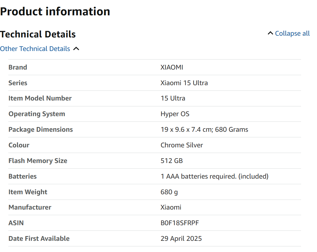 Xiaomi 15 Ultra Smartphone 16GB+512GB, Chrome Silver